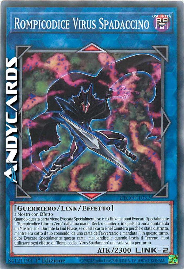 Quando questa carta viene Evocata Specialmente se è co-linkata: puoi Evocare Specialmente 1 "Rompicodice Giorno Zero" dalla tua mano, Deck o Cimitero, in qualsiasi zona puntata da un Mostro Link. Durante la End Phase, se questa carta è nel Cimitero perché è stata distrutta, mentre era sotto il tuo comando, da una carta dell'avversario e mandata lì in questo turno: puoi Evocare Specialmente questa carta, ma bandiscila quando lascia il Terreno. Puoi utilizzare ogni effetto di "Rompicodice Virus Spadaccino" una sola volta per turno.