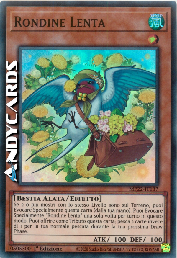 Se 2 o più mostri con lo stesso Livello sono sul Terreno, puoi Evocare Specialmente questa carta (dalla tua mano). Puoi Evocare Specialmente "Rondine Lenta" una sola volta per turno in questo modo. Puoi offrire come Tributo questa carta; pesca 2 carte invece di 1 per la tua normale pescata durante la tua prossima Draw Phase.
