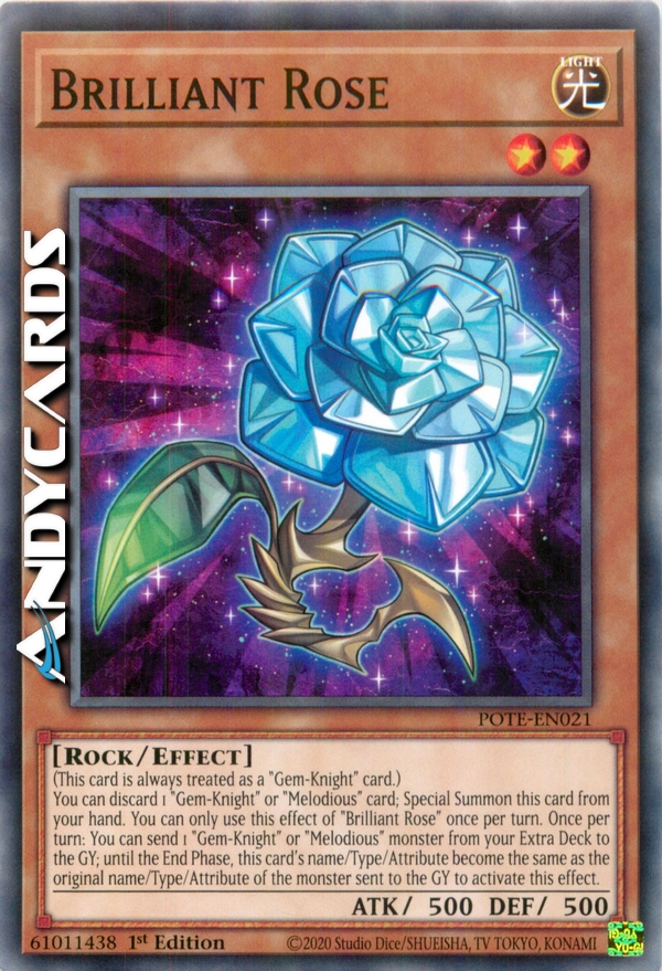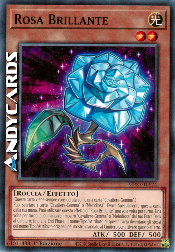 Puoi scartare 1 carta "Cavaliere-Gemma" o "Melodiosa"; Evoca Specialmente questa carta dalla tua mano. Puoi utilizzare questo effetto di "Rosa Brillante" una sola volta per turno. Una volta per turno: puoi mandare 1 mostro "Cavaliere-Gemma" o "Melodiosa" dal tuo Extra Deck al Cimitero; fino alla End Phase, il nome/Tipo/Attributo di questa carta diventano gli stessi del nome/Tipo/Attributo originali del mostro mandato al Cimitero per attivare questo effetto.
