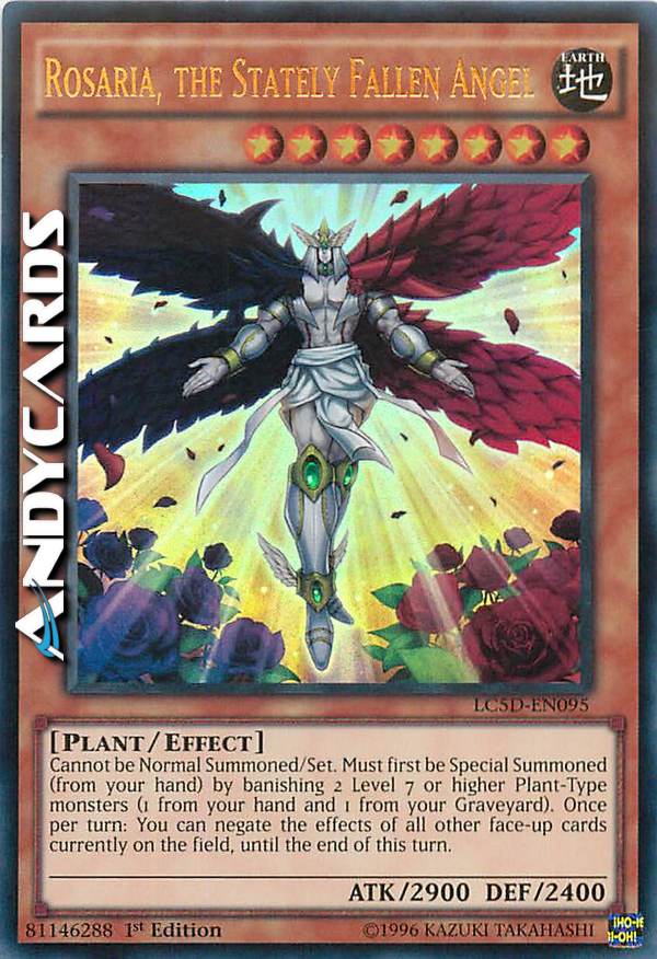 Non può essere evocato Specialmente/Posizionato. Deve prima essere Evocato Specialmente (dalla tua mano) bandendo 2 mostri di Tipo Pianta di Livello 7 o superiore (1 dalla tua mano e 1 dal tuo Cimitero). Una volta per turno: puoi annullare gli effetti di tutte le altre carte scoperte attualmente sul Terreno, fino alla fine di questo turno.