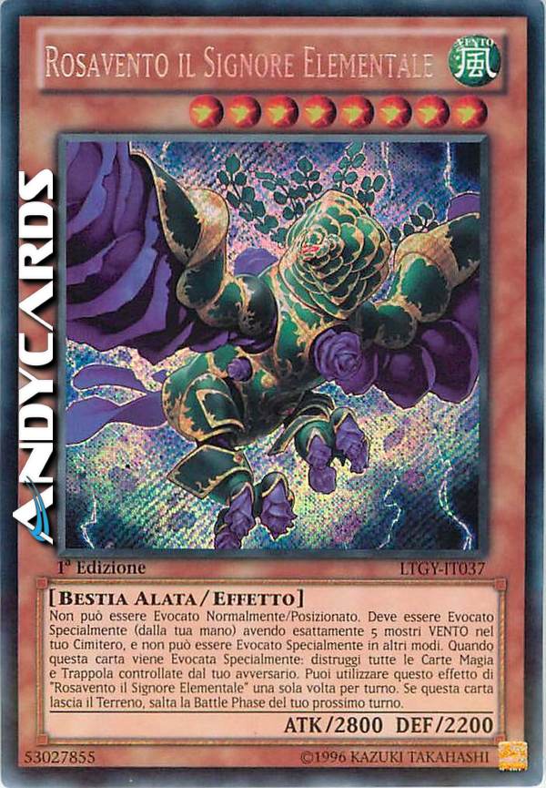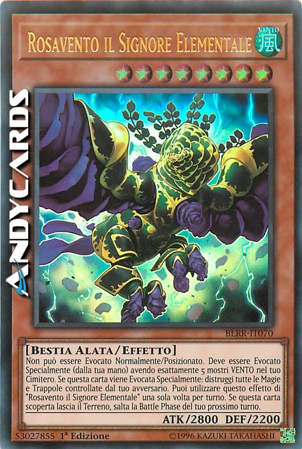 Non può essere Evocato Normalmente/Posizionato. Deve essere Evocato Specialmente (dalla tua mano) avendo esattamente 5 mostri VENTO nel tuo Cimitero, e non può essere Evocato Specialmente in altri modi. Quando questa carta viene Evocata Specialmente: distruggi tutte le Carte Magia/Trappola controllate dal tuo avversario. Puoi utilizzare questo effetto di "Windrose il Signore Elementale" solo una volta per turno. Se questa carta lascia il Terreno, salta la Battle Phase del tuo prossimo turno.