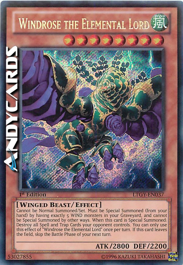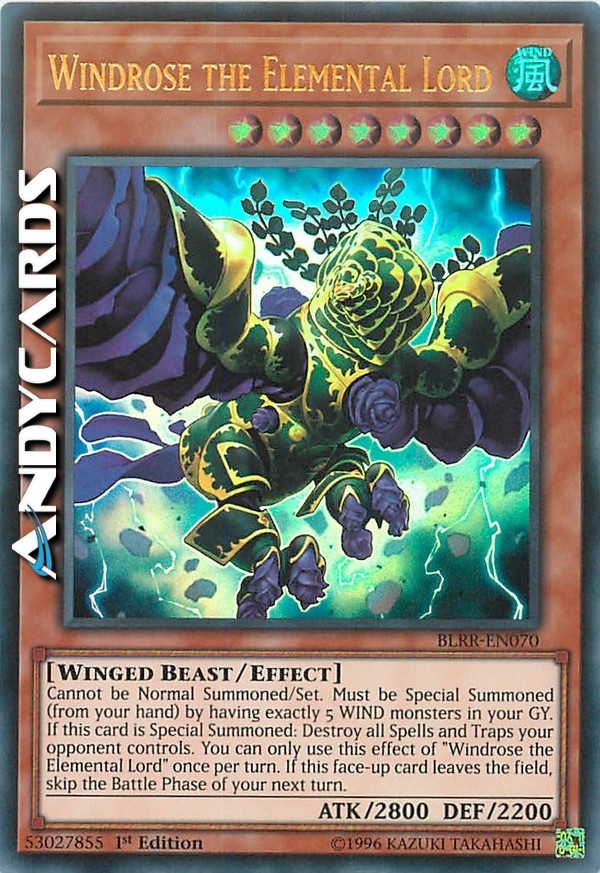 Cannot be Normal Summoned/Set. Must be Special Summoned (from your hand) by having exactly 5 WIND monsters in your Graveyard, and cannot be Special Summoned by other ways. When this card is Special Summoned: Destroy all Spell and Trap Cards your opponent controls. You can only use this effect of "Windrose the Elemental Lord" once per turn. If this card leaves the field, skip the Battle Phase of your next turn.