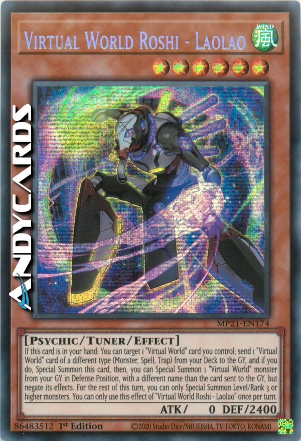 If this card is in your hand: You can target 1 "Virtual World" card you control; send 1 "Virtual World" card of a different type (Monster, Spell, Trap) from your Deck to the GY, and if you do, Special Summon this card, then, you can Special Summon 1 "Virtual World" monster from your GY in Defense Position, with a different name than the card sent to the GY, but negate its effects. For the rest of this turn, you can only Special Summon Level/Rank 3 or higher monsters. You can only use this effect of "Virtual World Roshi - Laolao" once per turn.