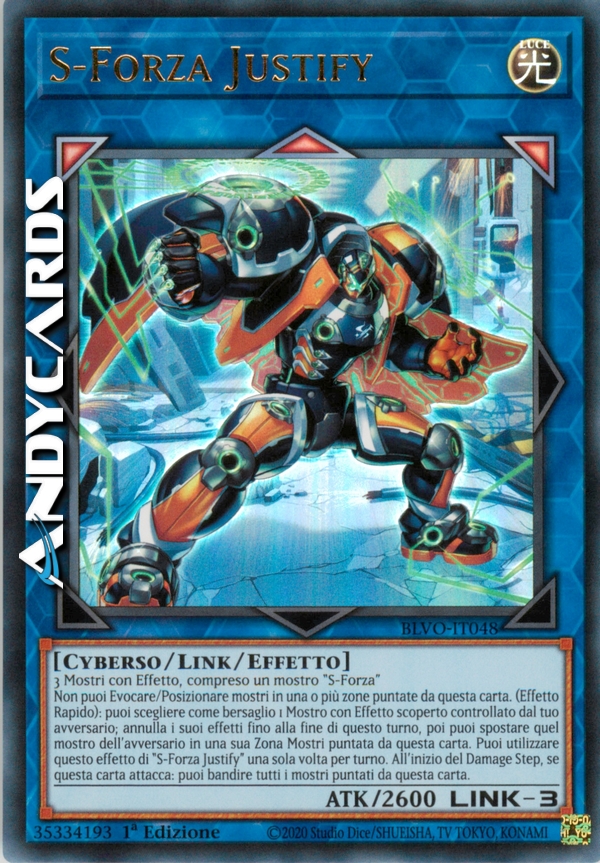 Non puoi Evocare/Posizionare mostri in una o più zone puntate da questa carta. (Effetto Rapido): puoi scegliere come bersaglio 1 Mostro con Effetto scoperto controllato dal tuo avversario; annulla i suoi effetti fino alla fine di questo turno, poi puoi spostare quel mostro dell'avversario in una sua Zona Mostri puntata da questa carta. Puoi utilizzare questo effetto di "S-Forza Justify" una sola volta per turno. All'inizio del Damage Step, se questa carta attacca: puoi bandire tutti i mostri puntati da questa carta.