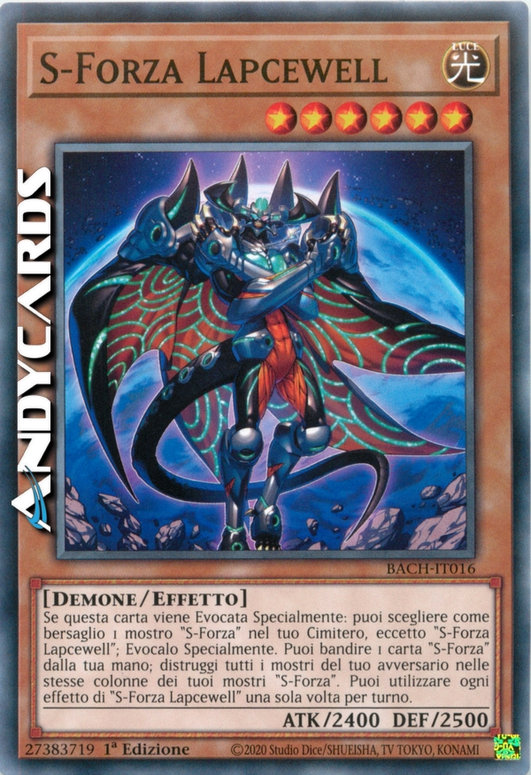 Se questa carta viene Evocata Specialmente: puoi scegliere come bersaglio 1 mostro "S-Forza" nel tuo Cimitero, eccetto "S-Forza Lapcewell"; Evocalo Specialmente. Puoi bandire 1 carta "S-Forza" dalla tua mano; distruggi tutti i mostri del tuo avversario nelle stesse colonne dei tuoi mostri "S-Forza". Puoi utilizzare ogni effetto di "S-Forza Lapcewell" una sola volta per turno.