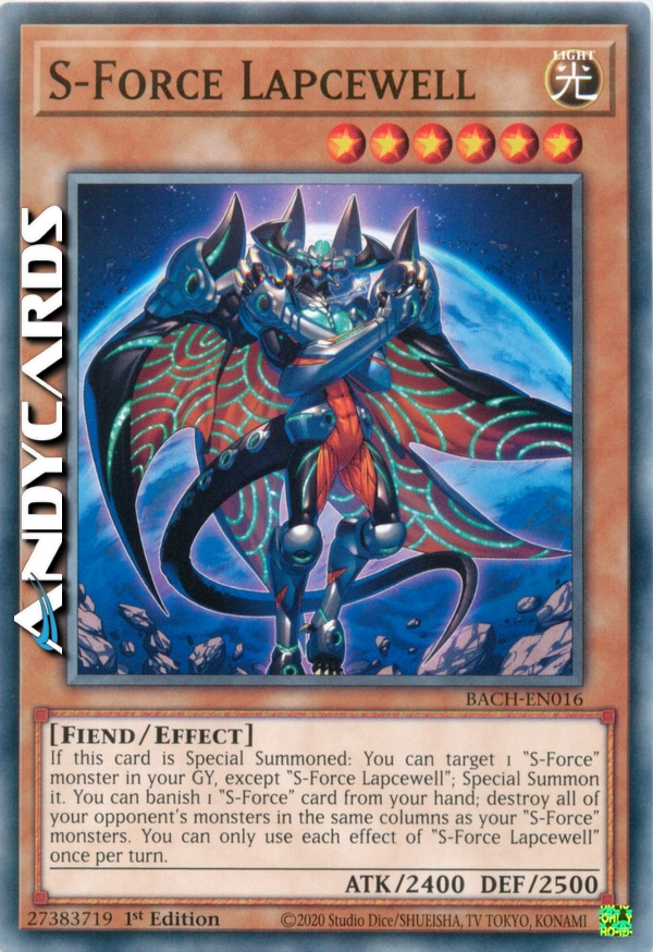 If this card is Special Summoned: You can target 1 "S-Force" monster in your GY, except "S-Force Lapcewell"; Special Summon it. You can banish 1 "S-Force" card from your hand; destroy all of your opponent's monsters in the same columns as your "S-Force" monsters. You can only use each effect of "S-Force Lapcewell" once per turn.