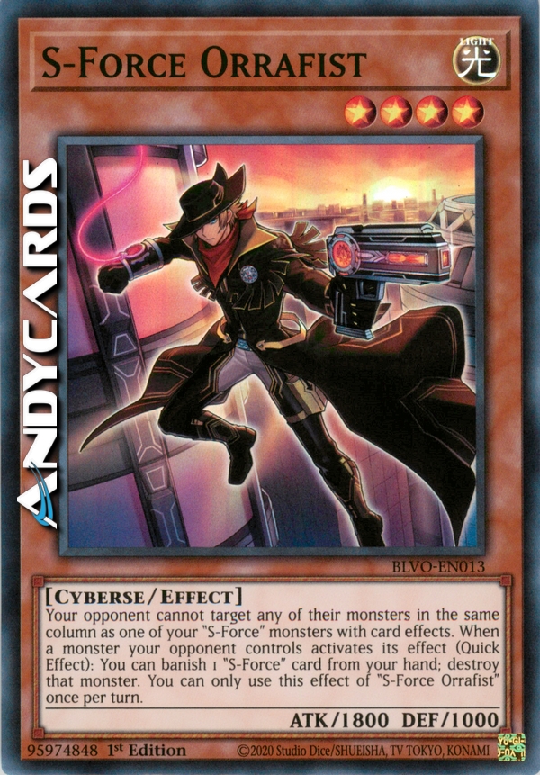 Your opponent cannot target any of their monsters in the same column as one of your "S-Force" monsters with card effects. When a monster your opponent controls activates its effect (Quick Effect): You can banish 1 "S-Force" card from your hand; destroy that monster. You can only use this effect of "S-Force Orrafist" once per turn.