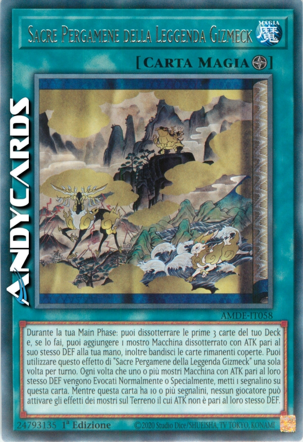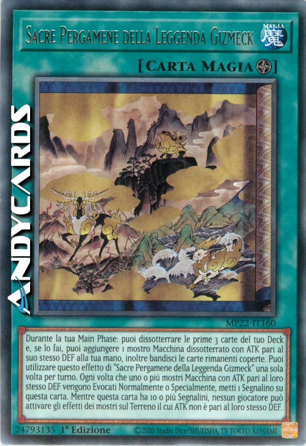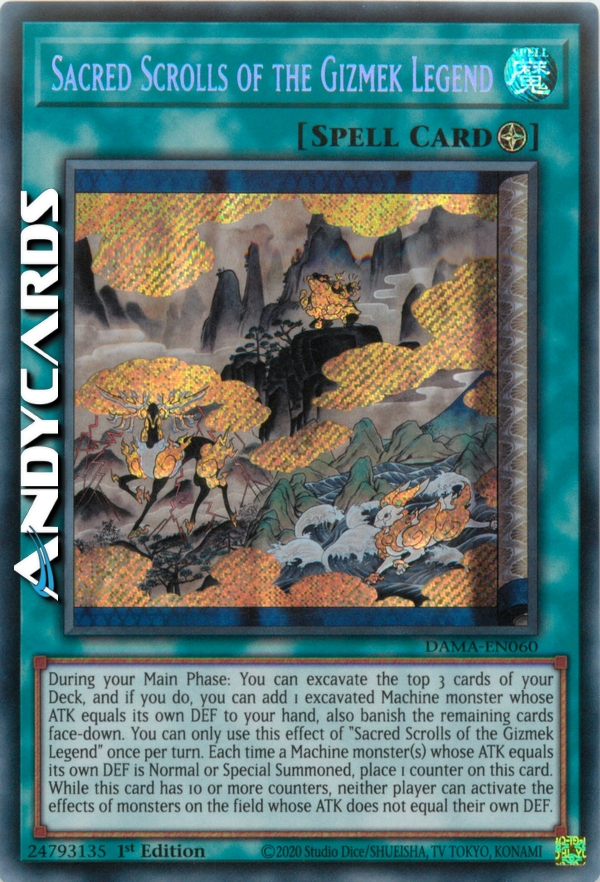 Durante la tua Main Phase: puoi dissotterrare le prime 3 carte del tuo Deck e, se lo fai, puoi aggiungere 1 mostro Macchina dissotterrato con ATK pari al suo stesso DEF alla tua mano, inoltre bandisci le carte rimanenti coperte. Puoi utilizzare questo effetto di "Sacre Pergamene della Leggenda Gizmeck" una sola volta per turno. Ogni volta che uno o più mostri Macchina con ATK pari al loro stesso DEF vengono Evocati Normalmente o Specialmente, metti 1 Segnalino su questa carta. Mentre questa carta ha 10 o più Segnalini, nessun giocatore può attivare gli effetti dei mostri sul Terreno il cui ATK non è pari al loro stesso DEF.