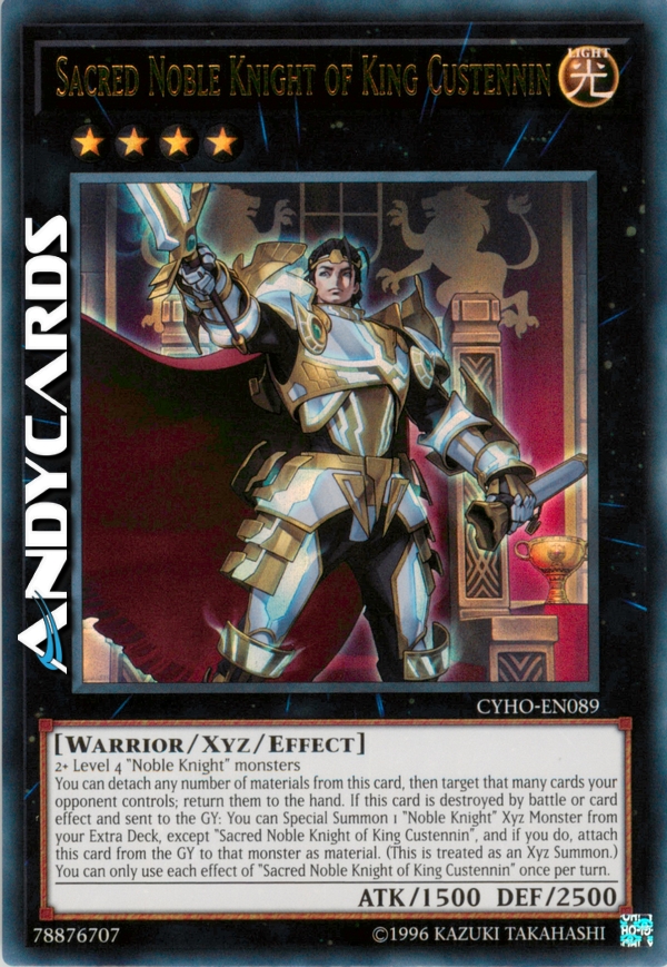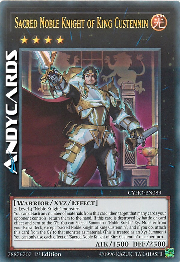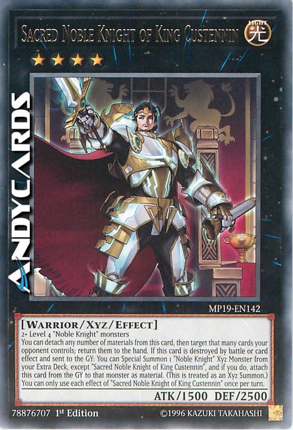 You can detach any number of materials from this card, then target that many cards your opponent controls; return them to the hand. If this card is destroyed by battle or card effect and sent to the GY: You can Special Summon 1 "Noble Knight" Xyz Monster from your Extra Deck, except "Sacred Noble Knight of King Custennin", and if you do, attach this card from the GY to that monster as material. (This is treated as an Xyz Summon.) You can only use each effect of "Sacred Noble Knight of King Custennin" once per turn.