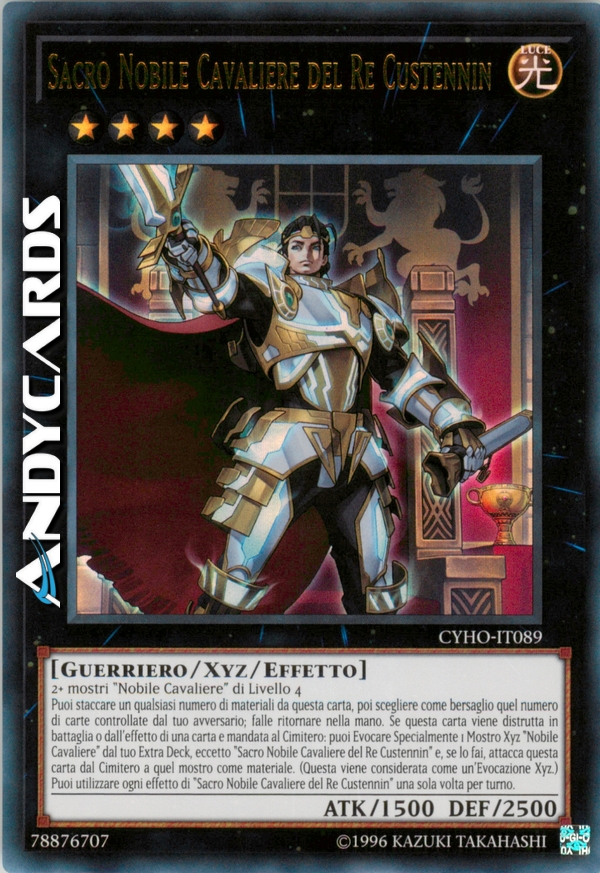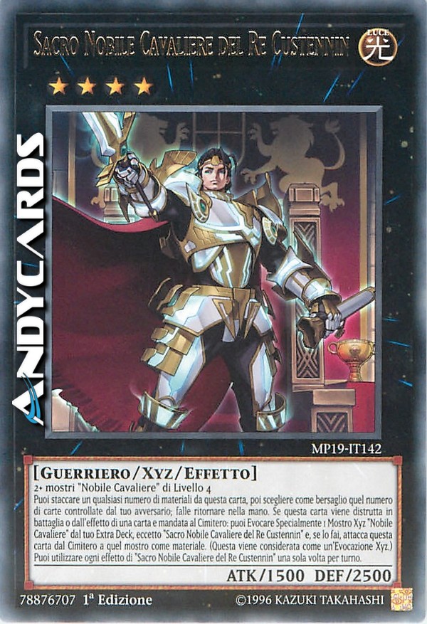 Puoi staccare un qualsiasi numero di materiali da questa carta, poi scegliere come bersaglio quel numero di carte controllate dal tuo avversario; falle ritornare nella mano. Se questa carta viene distrutta in battaglia o dall'effetto di una carta e mandata al Cimitero: puoi Evocare Specialmente 1 Mostro Xyz "Nobile Cavaliere" dal tuo Extra Deck, eccetto "Sacro Nobile Cavaliere del Re Custennin" e, se lo fai, attacca questa carta dal Cimitero a quel mostro come materiale. (Questa viene considerata come un'Evocazione Xyz.) Puoi utilizzare ogni effetto di "Sacro Nobile Cavaliere del Re Custennin" una sola volta per turno.