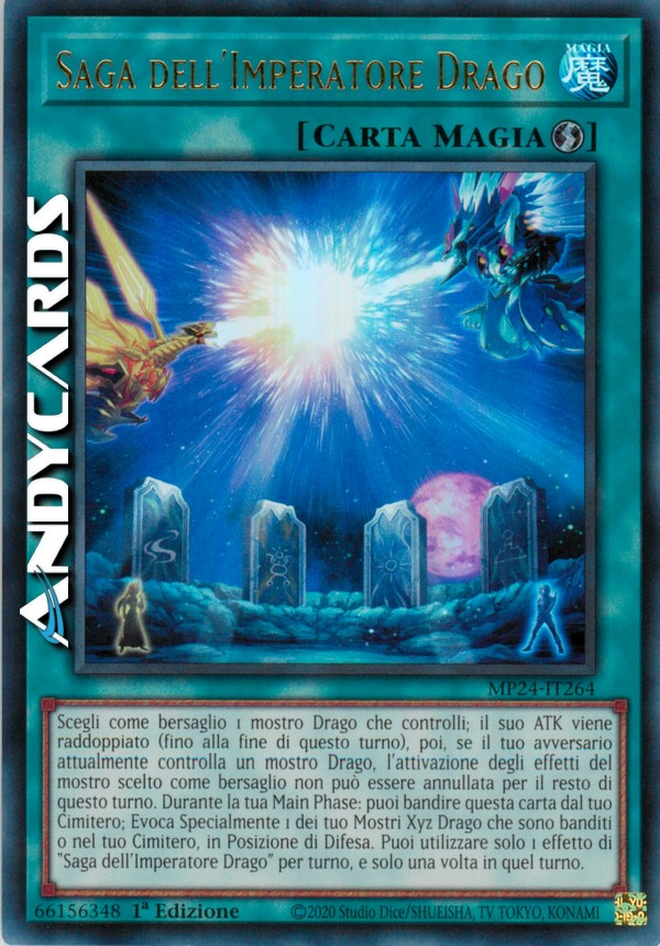 Scegli come bersaglio 1 mostro Drago che controlli; il suo ATK viene raddoppiato (fino alla fine di questo turno), poi, se il tuo avversario attualmente controlla un mostro Drago, l'attivazione degli effetti del mostro scelto come bersaglio non può essere annullata per il resto di questo turno. Durante la tua Main Phase: puoi bandire questa carta dal tuo Cimitero; Evoca Specialmente 1 dei tuo Mostri Xyz Drago che sono banditi o nel tuo Cimitero, in Posizione di Difesa. Puoi utilizzare solo 1 effetto di "Saga dell'Imperatore Drago" per turno, e solo una volta in quel turno.