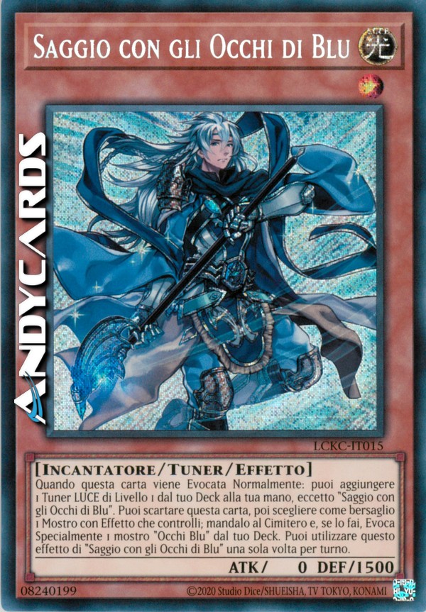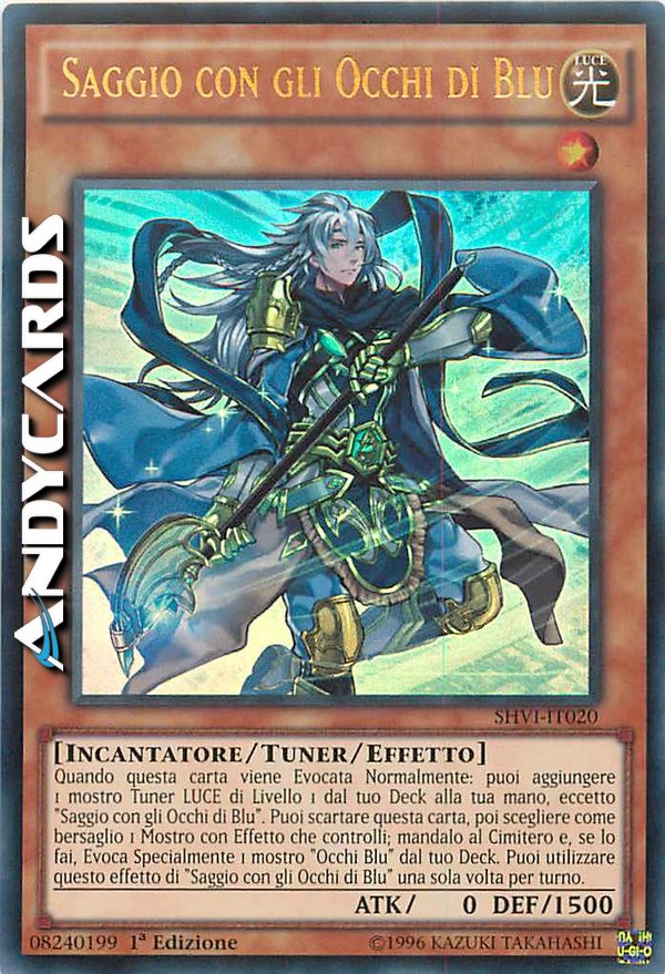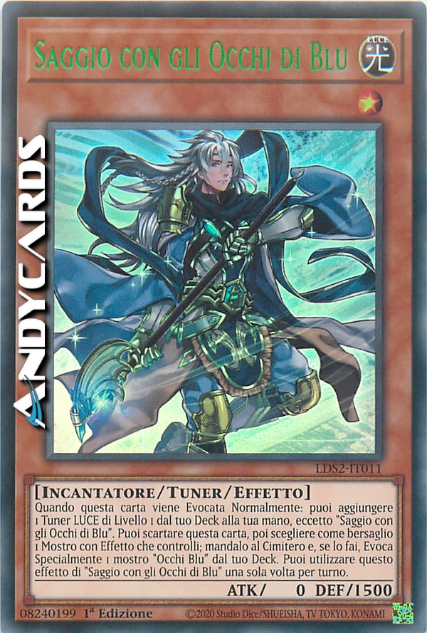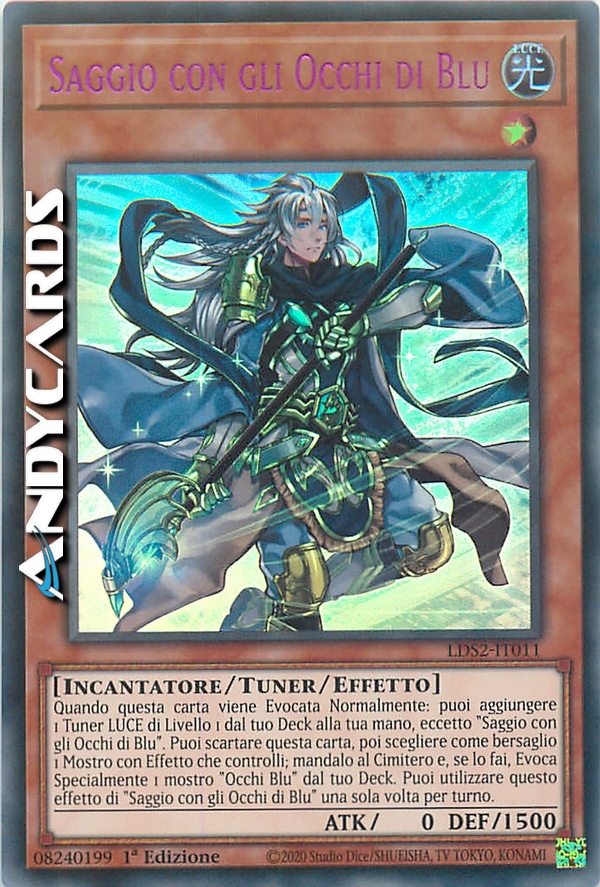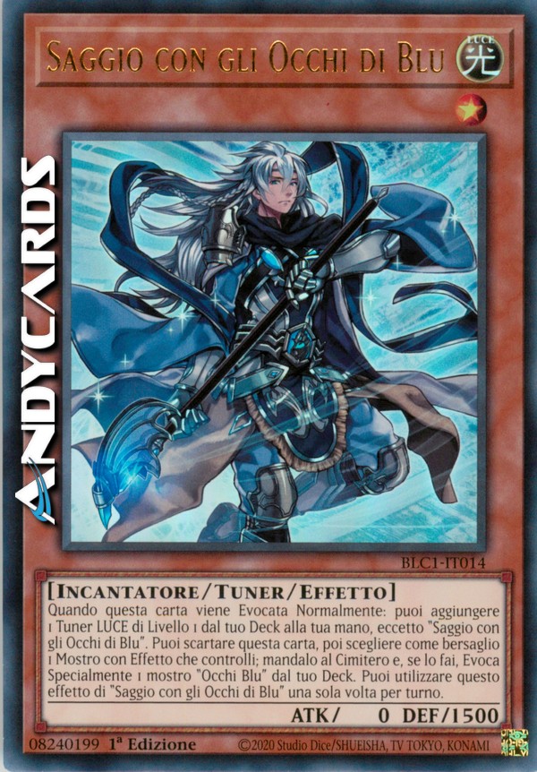Quando questa carta viene Evocata Normalmente: puoi aggiungere 1 Tuner LUCE di Livello 1 dal tuo Deck alla tua mano, eccetto "Saggio con gli Occhi di Blu". Puoi scartare questa carta, poi scegliere come bersaglio 1 Mostro con Effetto che controlli; mandalo al Cimitero e, se lo fai, Evoca Specialmente 1 mostro "Occhi Blu" dal tuo Deck. Puoi utilizzare questo effetto di "Saggio con gli Occhi di Blu" una sola volta per turno.