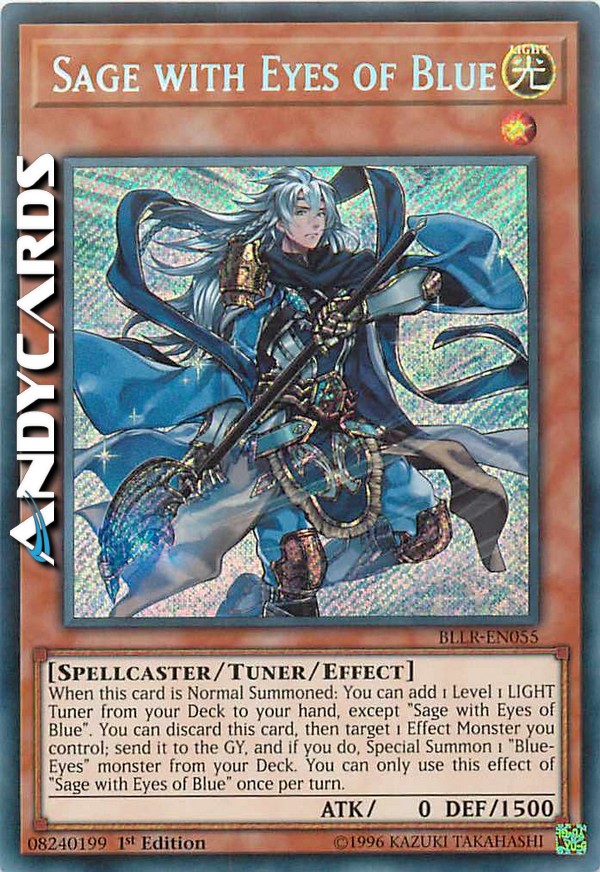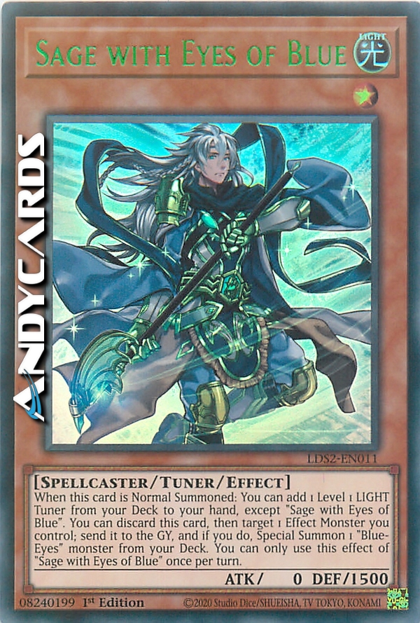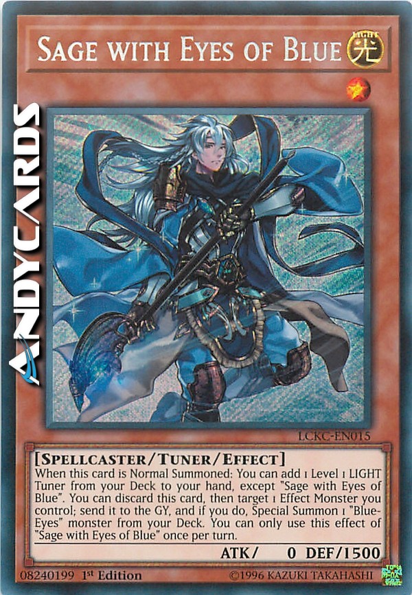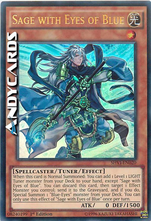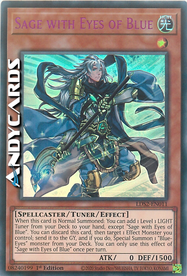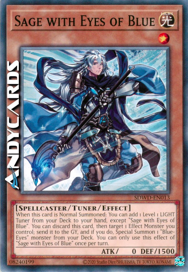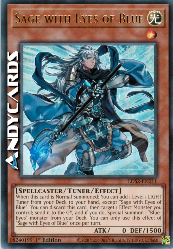 When this card is Normal Summoned: You can add 1 Level 1 LIGHT Tuner from your Deck to your hand, except "Sage with Eyes of Blue". You can discard this card, then target 1 Effect Monster you control; send it to the GY, and if you do, Special Summon 1 "Blue-Eyes" monster from your Deck. You can only use this effect of "Sage with Eyes of Blue" once per turn.