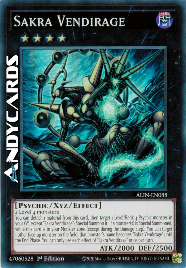 You can detach 1 material from this card, then target 1 Level/Rank 4 Psychic monster in your GY, except "Sakra Vendirage"; Special Summon it. If a monster(s) is Special Summoned, while this card is in your Monster Zone (except during the Damage Step): You can target 1 other face-up monster on the field; that monster's name becomes "Sakra Vendirage" until the End Phase. You can only use each effect of "Sakra Vendirage" once per turn.