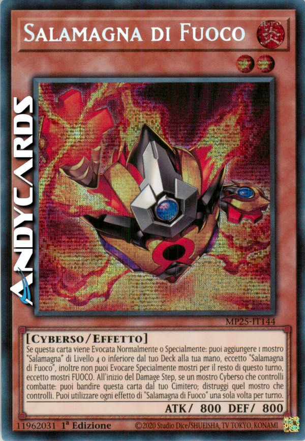 Se questa carta viene Evocata Normalmente o Specialmente: puoi aggiungere 1 mostro "Salamagna" di Livello 4 o inferiore dal tuo Deck alla tua mano, eccetto "Salamagna di Fuoco", inoltre non puoi Evocare Specialmente mostri per il resto di questo turno, eccetto mostri FUOCO. All'inizio del Damage Step, se un mostro Cyberso che controlli combatte: puoi bandire questa carta dal tuo Cimitero; distruggi quel mostro che controlli. Puoi utilizzare ogni effetto di "Salamagna di Fuoco" una sola volta per turno.