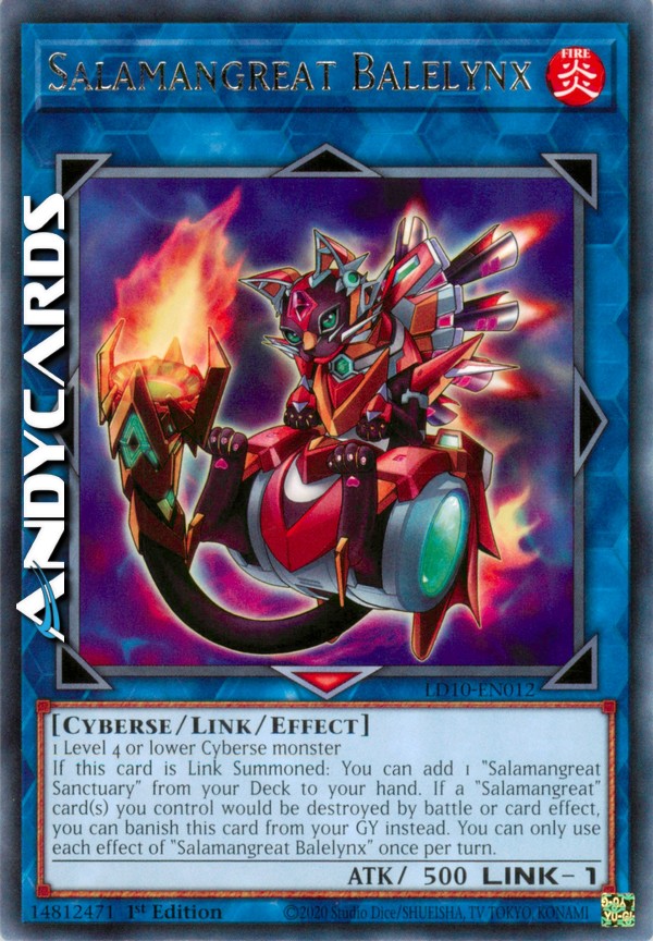 If this card is Link Summoned: You can add 1 "Salamangreat Sanctuary" from your Deck to your hand. If a "Salamangreat" card(s) you control would be destroyed by battle or card effect, you can banish this card from your GY instead. You can only use each effect of "Salamangreat Balelynx" once per turn.