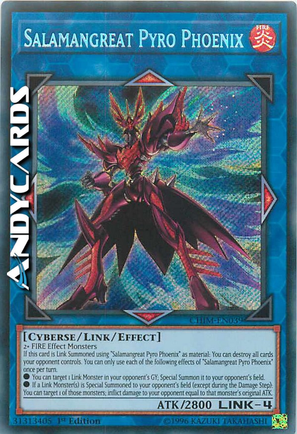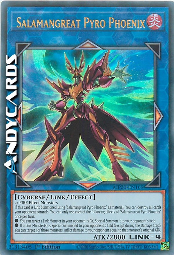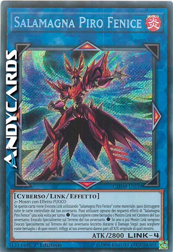 Se questa carta viene Evocata Link utilizzando "Salamagna Piro Fenice" come materiale: puoi distruggere tutte le carte controllate dal tuo avversario. Puoi utilizzare ognuno dei seguenti effetti di "Salamagna Piro Fenice" una sola volta per turno.