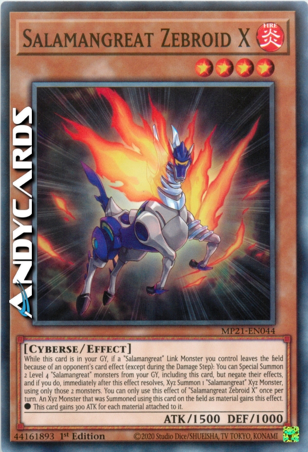 While this card is in your GY, if a "Salamangreat" Link Monster you control leaves the field because of an opponent's card effect (except during the Damage Step): You can Special Summon 2 Level 4 "Salamangreat" monsters from your GY, including this card, but negate their effects, and if you do, immediately after this effect resolves, Xyz Summon 1 "Salamangreat" Xyz Monster, using only those 2 monsters. You can only use this effect of "Salamangreat Zebroid X" once per turn. An Xyz Monster that was Summoned using this card on the field as material gains this effect.