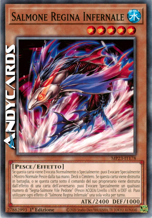 Se questa carta viene Evocata Normalmente o Specialmente: puoi Evocare Specialmente 1 Mostro Normale Pesce dalla tua mano, Deck o Cimitero. Se questa carta viene distrutta in battaglia, o se questa carta sotto il comando del suo proprietario viene distrutta dall'effetto di una carta dell'avversario: puoi Evocare Specialmente un qualsiasi numero di "Segna-Salmone Vile Pedone" (Pesce/ACQUA/Livello 1/ATK 0/DEF 0). Puoi utilizzare ogni effetto di "Salmone Regina Infernale" una sola volta per turno.