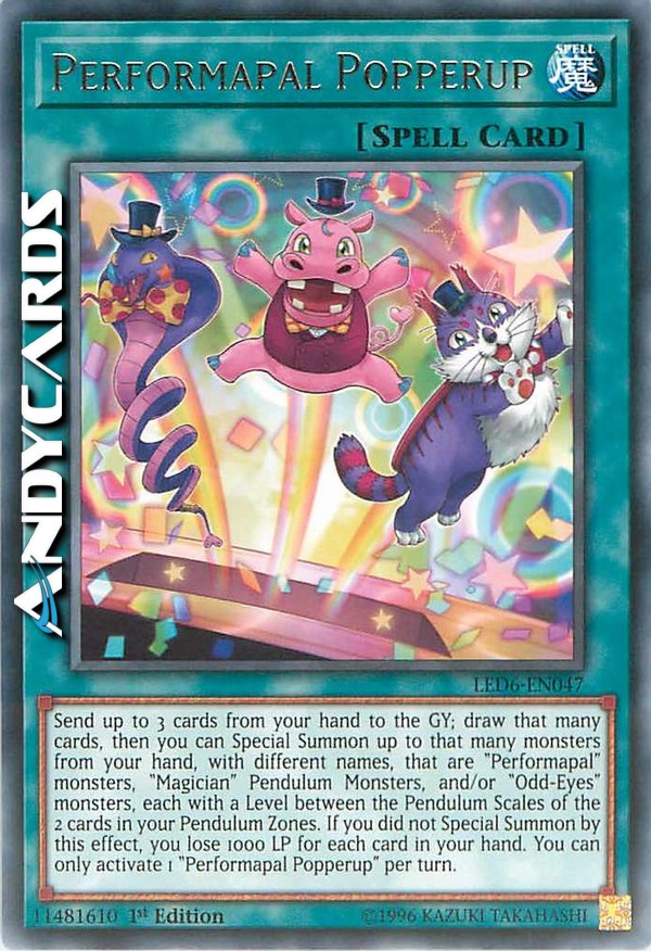 Send up to 3 cards from your hand to the GY; draw that many cards, then you can Special Summon up to that many monsters from your hand, with different names, that are "Performapal" monsters, "Magician" Pendulum Monsters, and/or "Odd-Eyes" monsters, each with a Level between the Pendulum Scales of the 2 cards in your Pendulum Zones. If you did not Special Summon by this effect, you lose 1000 LP for each card in your hand. You can only activate 1 "Performapal Popperup" per turn.