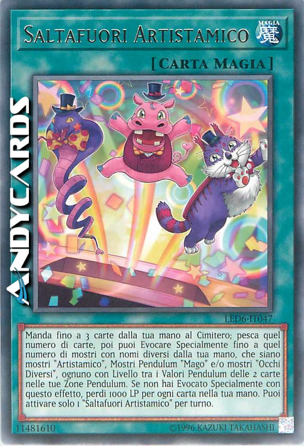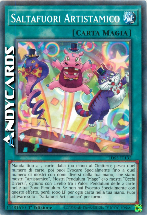 Manda fino a 3 carte dalla tua mano al Cimitero; pesca quel numero di carte, poi puoi Evocare Specialmente fino a quel numero di mostri con nomi diversi dalla tua mano, che siano mostri "Artistamico", Mostri Pendulum "Mago" e/o mostri "Occhi Diversi", ognuno con Livello tra i Valori Pendulum delle 2 carte nelle tue Zone Pendulum. Se non hai Evocato Specialmente con questo effetto, perdi 1000 LP per ogni carta nella tua mano. Puoi attivare solo 1 "Saltafuori Artistamico" per turno.