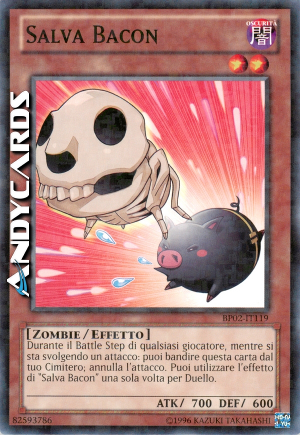 Durante il Battle Step di qualsiasi giocatore, mentre si sta svolgendo un attacco: puoi bandire questa carta dal tuo Cimitero; annulla l'attacco. Puoi utilizzare l'effetto di "Salva Bacon" una sola volta per Duello.