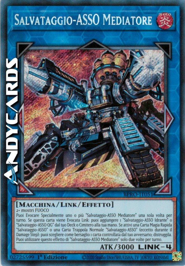 Puoi Evocare Specialmente uno o più "Salvataggio-ASSO Mediatore" una sola volta per turno. Se questa carta viene Evocata Link: puoi aggiungere 1 "Salvataggio-ASSO Idrante" o "Salvataggio-ASSO QG" dal tuo Deck o Cimitero alla tua mano. Se attivi una Carta Magia Rapida "Salvataggio-ASSO" o una Carta Trappola Normale "Salvataggio-ASSO" (eccetto durante il Damage Step): puoi scegliere come bersaglio 1 carta controllata dal tuo avversario; distruggila. Puoi utilizzare questo effetto di "Salvataggio-ASSO Mediatore" solo due volte per turno.