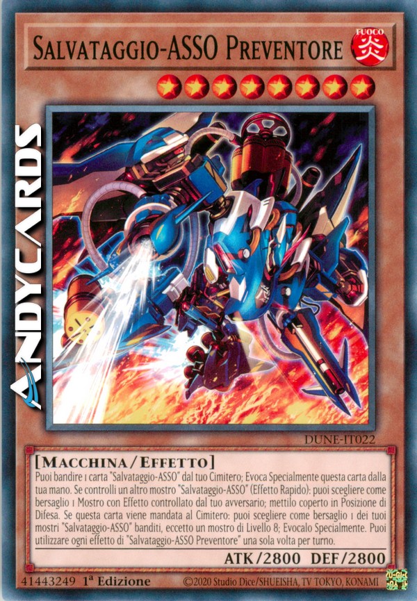 Puoi bandire 1 carta "Salvataggio-ASSO" dal tuo Cimitero; Evoca Specialmente questa carta dalla tua mano. Se controlli un altro mostro "Salvataggio-ASSO" (Effetto Rapido): puoi scegliere come bersaglio 1 Mostro con Effetto controllato dal tuo avversario; mettilo coperto in Posizione di Difesa. Se questa carta viene mandata al Cimitero: puoi scegliere come bersaglio 1 dei tuoi mostri "Salvataggio-ASSO" banditi, eccetto un mostro di Livello 8; Evocalo Specialmente. Puoi utilizzare ogni effetto di "Salvataggio-ASSO Preventore" una sola volta per turno.
