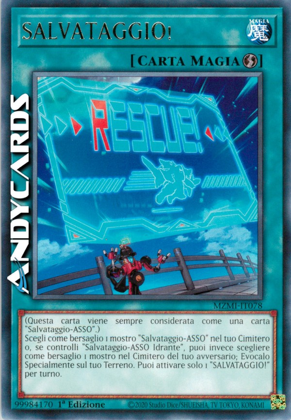 Scegli come bersaglio 1 mostro "Salvataggio-ASSO" nel tuo Cimitero o, se controlli "Salvataggio-ASSO Idrante", puoi invece scegliere come bersaglio 1 mostro nel Cimitero del tuo avversario; Evocalo Specialmente sul tuo Terreno. Puoi attivare solo 1 "SALVATAGGIO!" per turno.