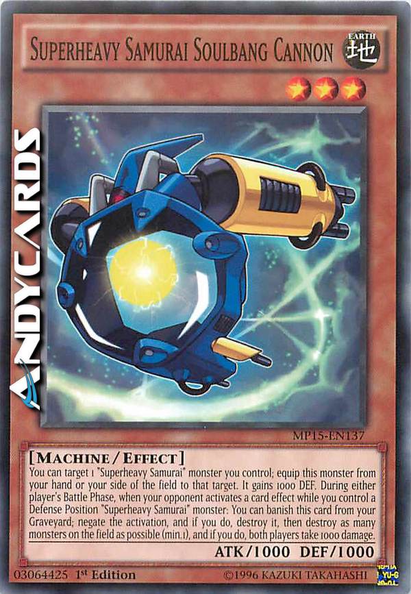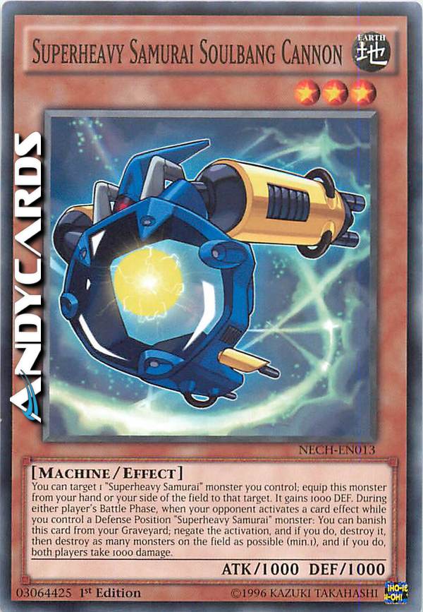 You can target 1 "Superheavy Samurai" monster you control; equip this monster from your hand or your side of the field to that target. It gains 1000 DEF. During either player's Battle Phase, when your opponent activates a card effect while you control a Defense Position "Superheavy Samurai" monster: You can banish this card from your Graveyard; negate the activation, and if you do, destroy it, then destroy as many monsters on the field as possible (min.1), and if you do, both players take 1000 damage.