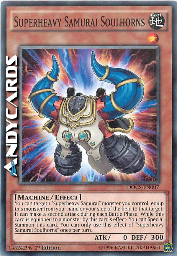 You can target 1 "Superheavy Samurai" monster you control; equip this monster from your hand or your side of the field to that target. It can make a second attack during each Battle Phase. While this card is equipped to a monster by this card's effect: You can Special Summon this card. You can only use this effect of "Superheavy Samurai Soulhorns" once per turn.