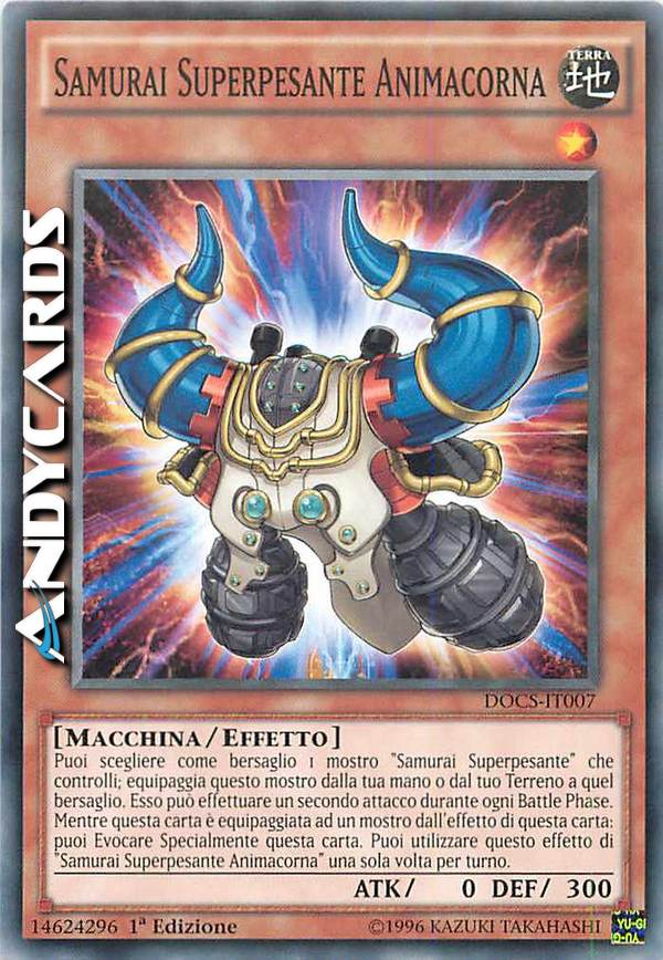 Puoi scegliere come bersaglio 1 mostro "Samurai Superpesante" che controlli; equipaggia questo mostro dalla tua mano o dal tuo Terreno a quel bersaglio. Esso può effettuare un secondo attacco durante ogni Battle Phase. Mentre questa carta è equipaggiata ad un mostro dall'effetto di questa carta: puoi Evocare Specialmente questa carta. Puoi utilizzare questo effetto di "Samurai Superpesante Animacorna" una sola volta per turno.