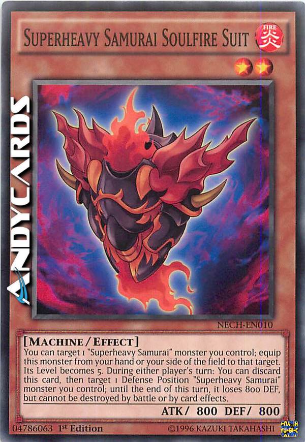You can target 1 "Superheavy Samurai" monster you control; equip this monster from your hand or your side of the field to that target. Its Level becomes 5. During either player's turn: You can discard this card, then target 1 Defense Position "Superheavy Samurai" monster you control; until the end of this turn, it loses 800 DEF, but cannot be destroyed by battle or by card effects.