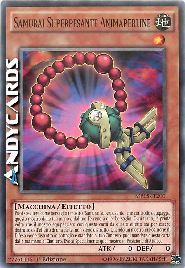 Puoi scegliere come bersaglio 1 mostro "Samurai Superpesante" che controlli; equipaggia questo mostro dalla tua mano o dal tuo Terreno a quel bersaglio. Ogni turno, la prima volta che il mostro equipaggiato con questa carta da questo effetto sta per essere distrutto dall'effetto di una carta, non viene distrutto. Quando un mostro in Posizione di Difesa viene distrutto in battaglia e mandato al tuo Cimitero: puoi mandare questa carta dalla tua mano al Cimitero; Evoca Specialmente quel mostro in Posizione di Attacco.