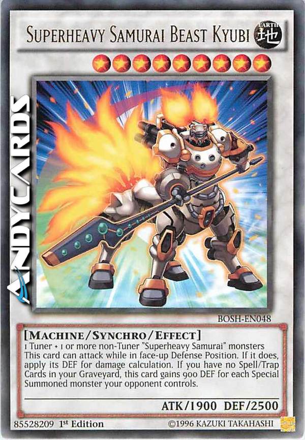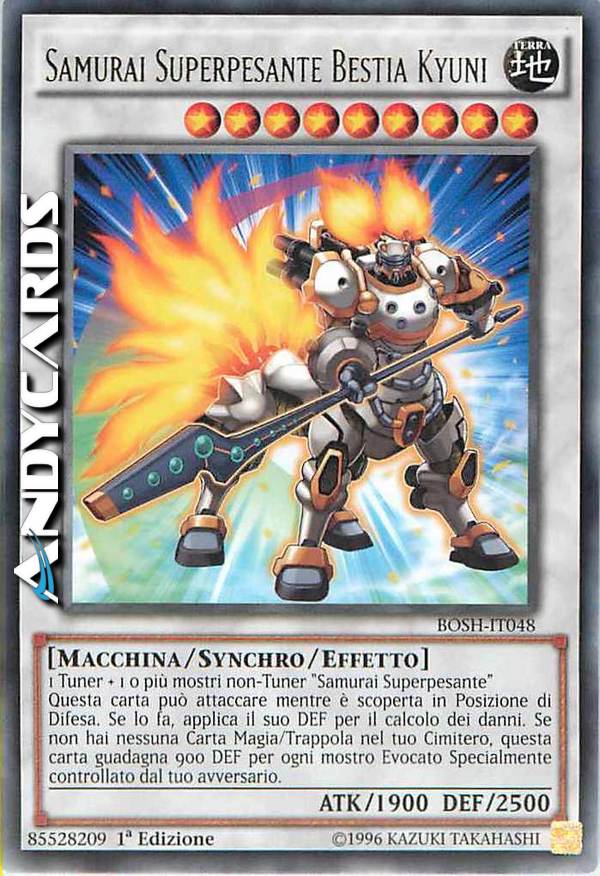 1 Tuner + 1 o più mostri non-Tuner "Samurai Superpesante" - Questa carta può attaccare mentre è scoperta in Posizione di Difesa. Se lo fa, applica il suo DEF per il calcolo dei danni. Se non hai nessuna Carta Magia/Trappola nel tuo Cimitero, questa carta guadagna 900 DEF per ogni mostro Evocato Specialmente controllato dal tuo avversario.