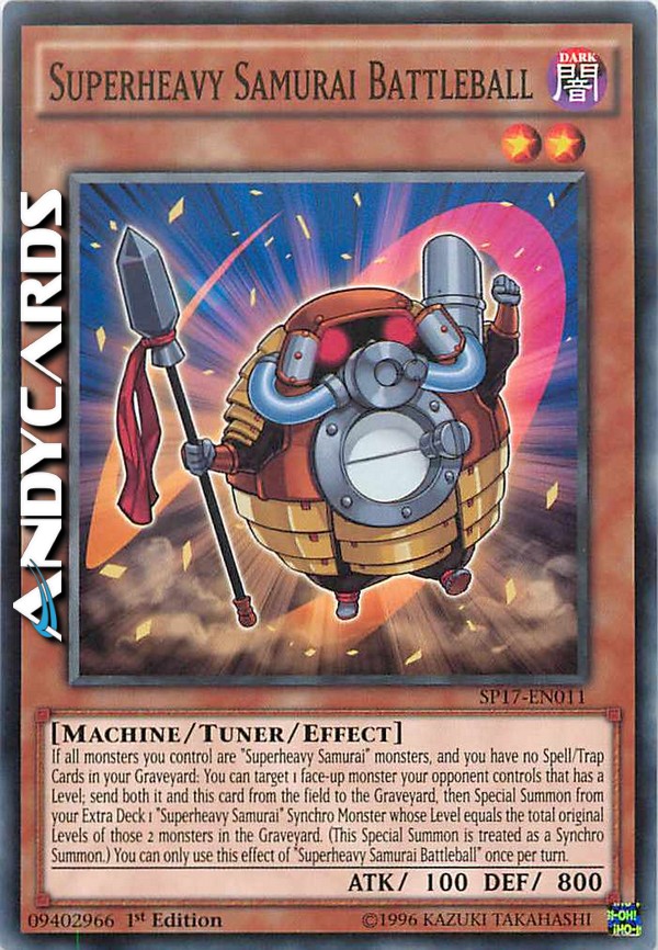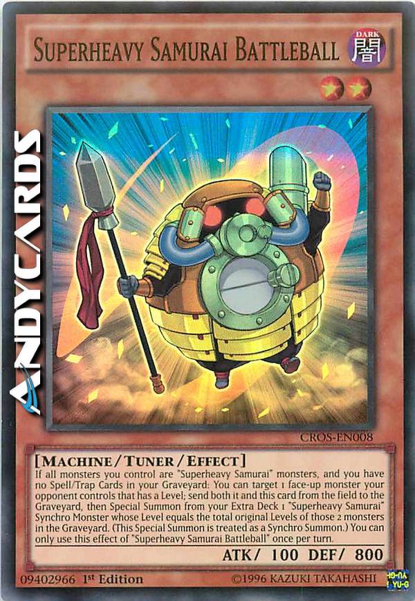 If all monsters you control are "Superheavy Samurai" monsters, and you have no Spell/Trap Cards in your Graveyard: You can target 1 face-up monster your opponent controls that has a Level; send both it and this card from the field to the Graveyard, then Special Summon from your Extra Deck 1 "Superheavy Samurai" Synchro Monster whose Level equals the total original Levels of those 2 monsters in the Graveyard. (This Special Summon is treated as a Synchro Summon.) You can only use this effect of "Superheavy Samurai Battleball" once per turn.