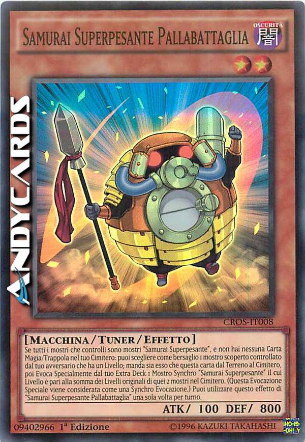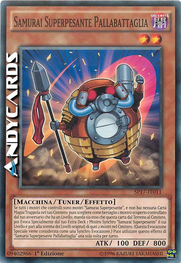 Se tutti i mostri che controlli sono mostri "Samurai Superpesante", e non hai nessuna Carta Magia/Trappola nel tuo Cimitero: puoi scegliere come bersaglio 1 mostro scoperto controllato dal tuo avversario che ha un Livello; manda sia esso che questa carta dal Terreno al Cimitero, poi Evoca Specialmente dal tuo Extra Deck 1 Mostro Synchro "Samurai Superpesante" il cui Livello è pari alla somma dei Livelli originali di quei 2 mostri nel Cimitero. (Questa Evocazione Speciale viene considerata come una Synchro Evocazione.) Puoi utilizzare questo effetto di "Samurai Superpesante Pallabattaglia" una sola volta per turno.