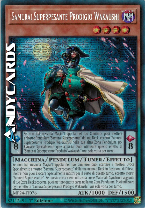 Se non hai nessuna Magia/Trappola nel tuo Cimitero: puoi scartare 1 mostro; Evoca Specialmente 1 mostro "Samurai Superpesante" dalla tua mano o Deck in Posizione di Difesa, inoltre non puoi Evocare Specialmente mostri per il resto di questo turno, eccetto mostri "Samurai Superpesante". Se questa carta viene utilizzata come Materiale Synchro e aggiunta al tuo Extra Deck scoperta: puoi mettere questa carta nella tua Zona Pendulum. Puoi utilizzare ogni effetto di "Samurai Superpesante Prodigio Wakaushi" una sola volta per turno.