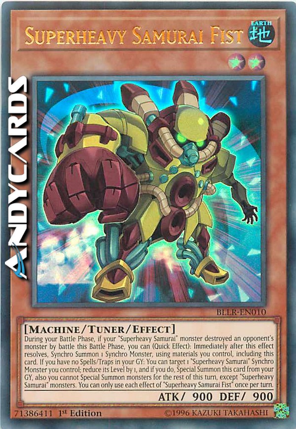 During your Battle Phase, if your "Superheavy Samurai" monster destroyed an opponent's monster by battle this Battle Phase, you can (Quick Effect): Immediately after this effect resolves, Synchro Summon 1 Synchro Monster, using materials you control, including this card. If you have no Spells/Traps in your GY: You can target 1 "Superheavy Samurai" Synchro Monster you control; reduce its Level by 1, and if you do, Special Summon this card from your GY, also you cannot Special Summon monsters for the rest of this turn, except "Superheavy Samurai" monsters. You can only use each effect of "Superheavy Samurai Fist" once per turn.