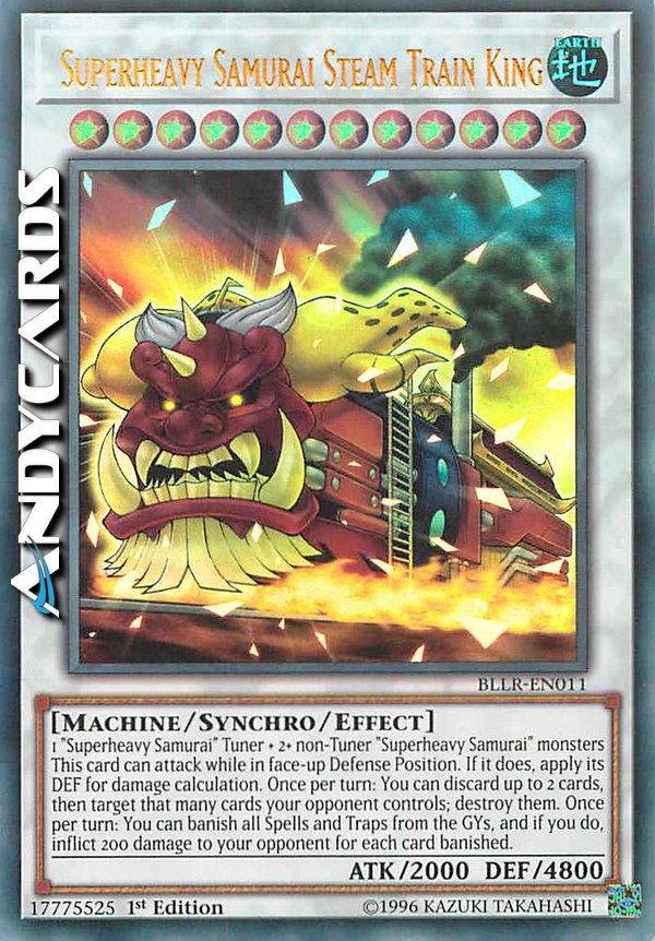 1 Tuner "Samurai Superpesante" + 2+ mostri non-Tuner "Samurai Superpesante" - Questa carta può attaccare mentre è scoperta in Posizione di Difesa. Se lo fa, applica il suo DEF per il calcolo dei danni. Una volta per turno: puoi scartare fino a 2 carte, poi scegliere come bersaglio quel numero di carte controllate dal tuo avversario; distruggile. Una volta per turno: puoi bandire tutte le Magie e Trappole dai Cimiteri e, se lo fai, infliggi 200 danni al tuo avversario per ogni carta bandita.