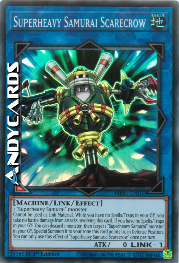 Cannot be used as Link Material. While you have no Spells/Traps in your GY, you take no battle damage from attacks involving this card. If you have no Spells/Traps in your GY: You can discard 1 monster, then target 1 "Superheavy Samurai" monster in your GY; Special Summon it to your zone this card points to, in Defense Position. You can only use this effect of "Superheavy Samurai Scarecrow" once per turn.