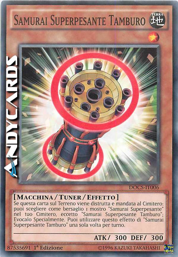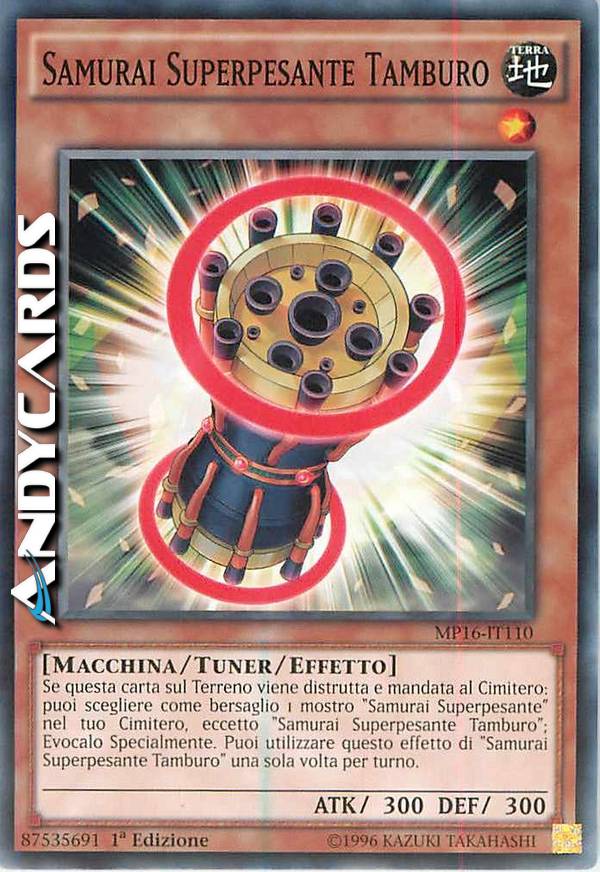 Se questa carta sul Terreno viene distrutta e mandata al Cimitero: puoi scegliere come bersaglio 1 mostro "Samurai Superpesante" nel tuo Cimitero, eccetto "Samurai Superpesante Tamburo"; Evocalo Specialmente. Puoi utilizzare questo effetto di "Samurai Superpesante Tamburo" una sola volta per turno.