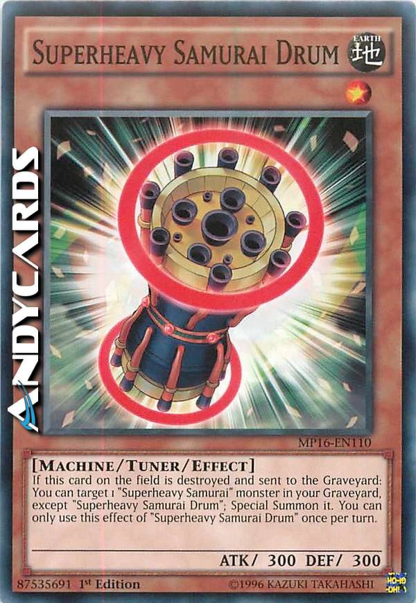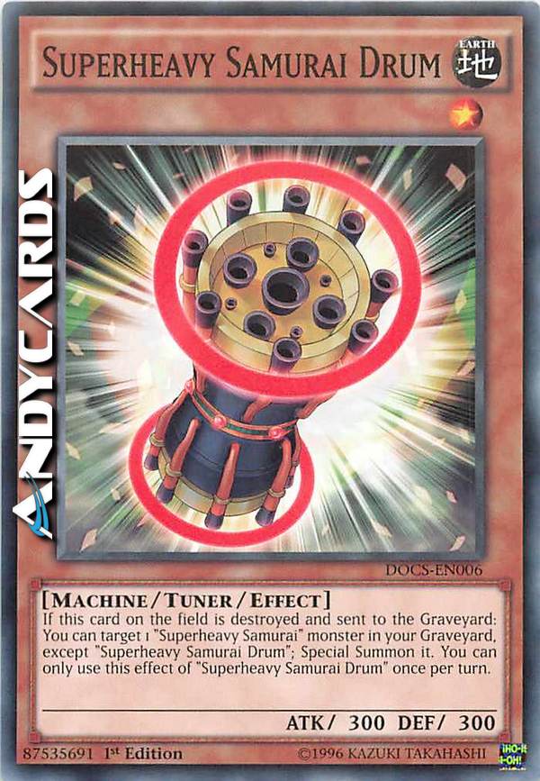 If this card on the field is destroyed and sent to the Graveyard: You can target 1 "Superheavy Samurai" monster in your Graveyard, except "Superheavy Samurai Drum"; Special Summon it. You can only use this effect of "Superheavy Samurai Drum" once per turn.