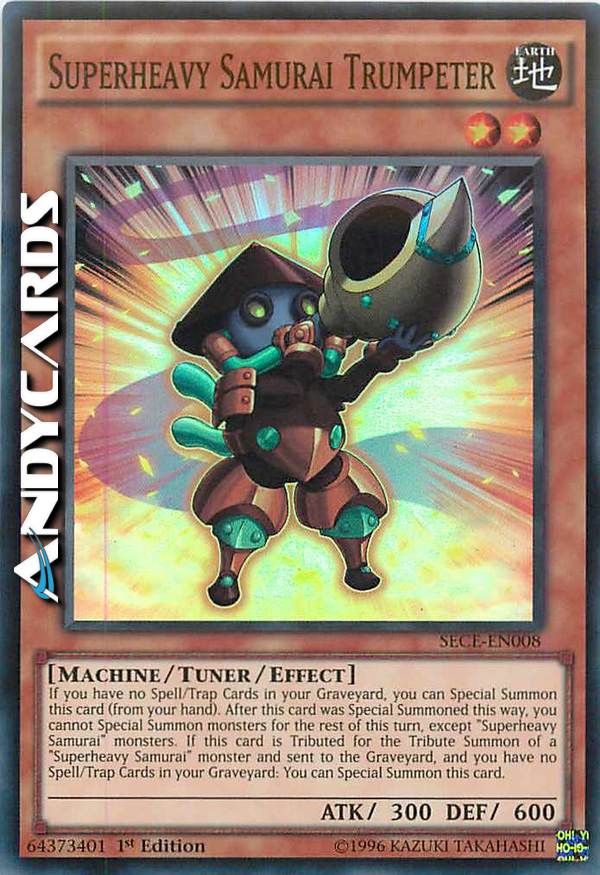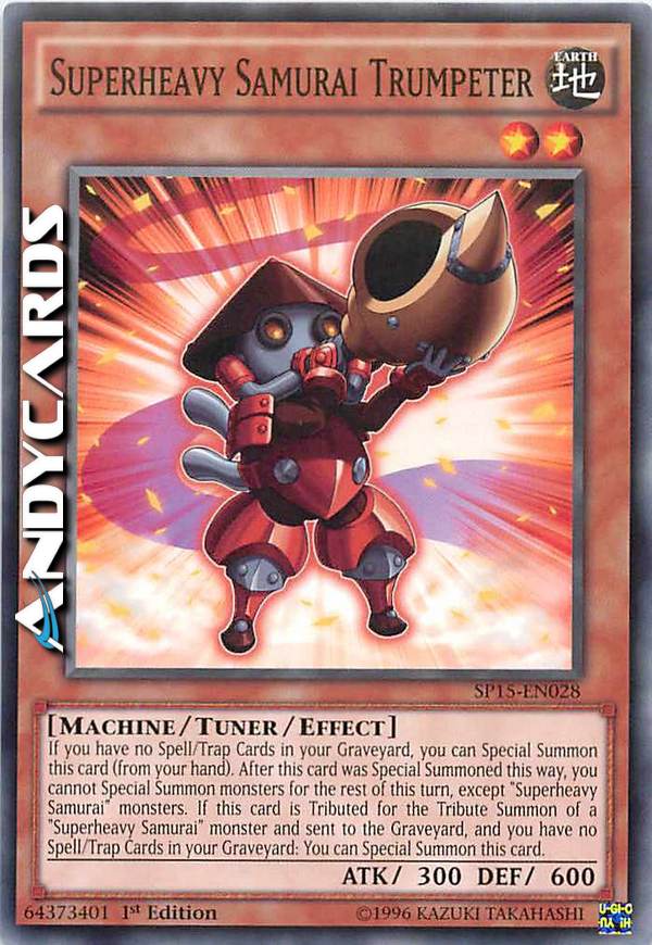 If you have no Spell/Trap Cards in your Graveyard, you can Special Summon this card (from your hand). After this card was Special Summoned this way, you cannot Special Summon monsters for the rest of this turn, except "Superheavy Samurai" monsters. If this card is Tributed for the Tribute Summon of a "Superheavy Samurai" monster and sent to the Graveyard, and you have no Spell/Trap Cards in your Graveyard: You can Special Summon this card.