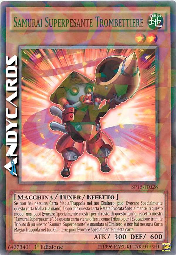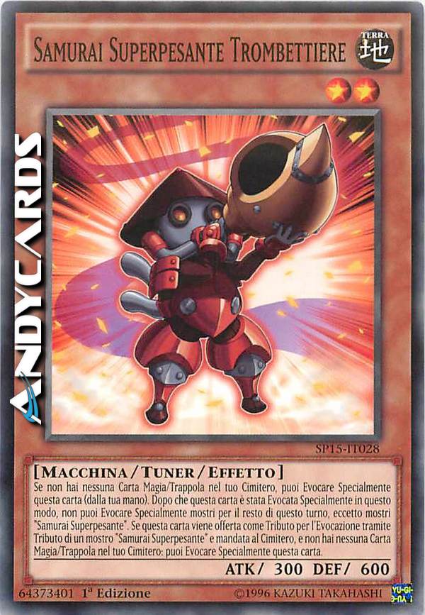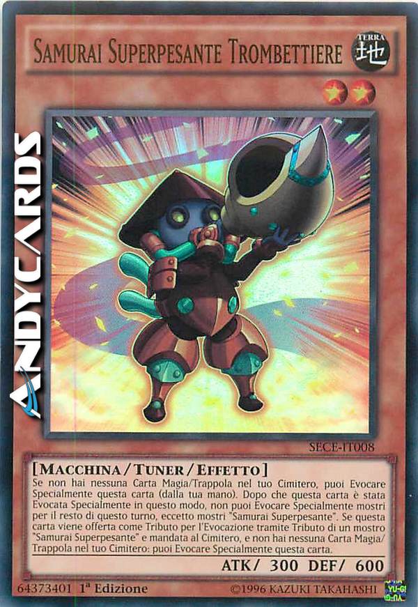 Se non hai nessuna carta Magia/Trappola nel tuo Cimitero, puoi Evocare Specialmente questa carta (dalla tua mano). Dopo che questa carta è stata Evocata Specialmente in questo modo, non puoi Evocare Specialmente mostri per il resto di questo turno, eccetto mostri "Samurai Superpesante". Se questa carta viene offerta come Tributo per l'Evocazione tramite Tributo di un mostro "Samurai Superpesante" e mandata al cimitero, e non hai nessuna Carta Magia/Trappola nel tuo Cimitero: puoi Evocare Specialmente questa carta.
