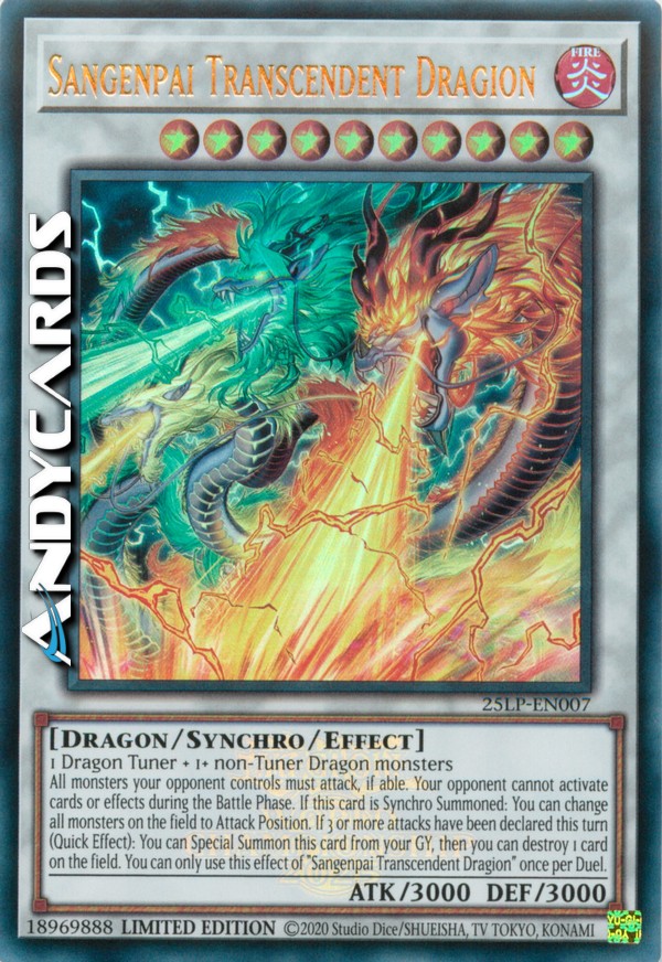 1 Dragon Tuner + 1+ non-Tuner Dragon monsters All monsters your opponent controls must attack, if able. Your opponent cannot activate cards or effects during the Battle Phase. If this card is Synchro Summoned: You can change all monsters on the field to Attack Position. If 3 or more attacks have been declared this turn (Quick Effect): You can Special Summon this card from your GY, then you can destroy 1 card on the field. You can only use this effect of "Sangenpai Transcendent Dragion" once per Duel.