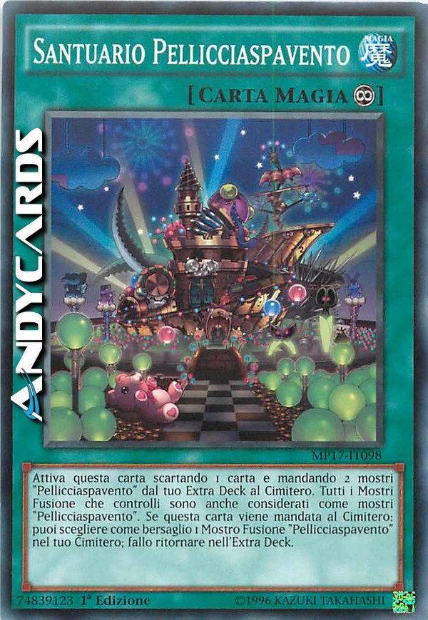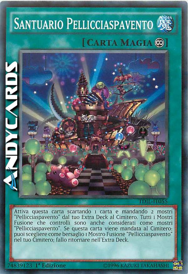 Attiva questa carta scartando 1 carta e mandando 2 mostri "Pellicciaspavento" dal tuo Extra Deck al Cimitero. Tutti i Mostri Fusione che controlli sono anche considerati come mostri "Pellicciaspavento". Se questa carta viene mandata al Cimitero: puoi scegliere come bersaglio 1 Mostro Fusione "Pellicciaspavento" nel tuo Cimitero; fallo ritornare nell'Extra Deck.