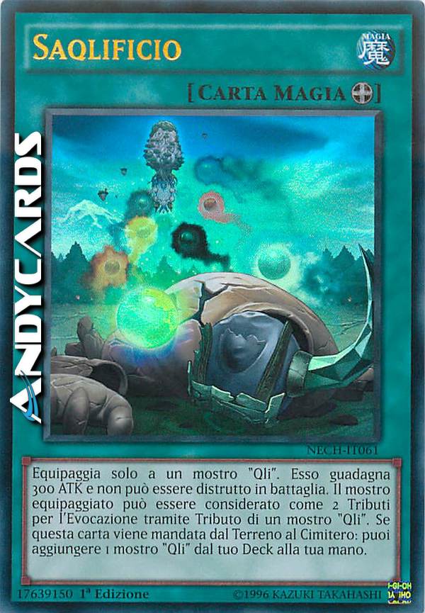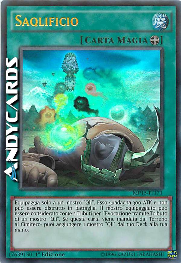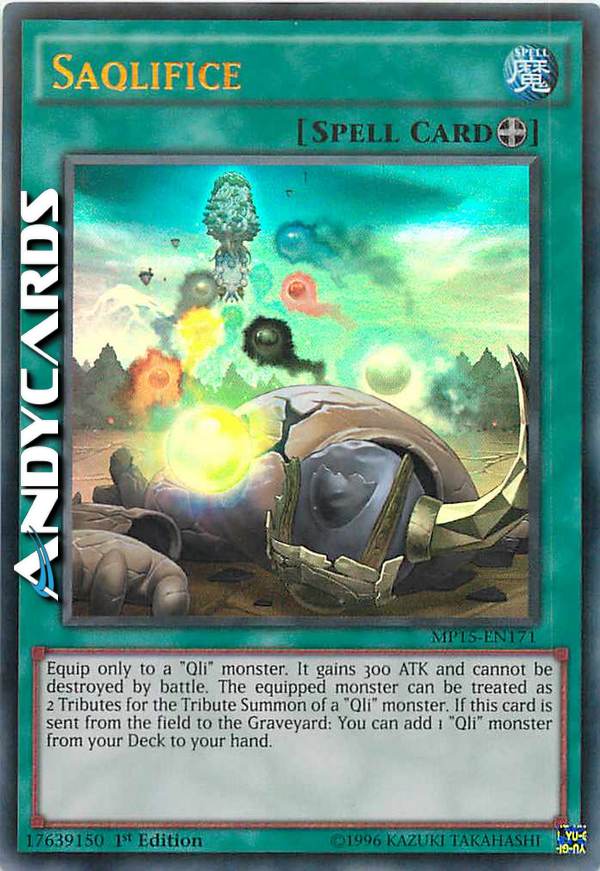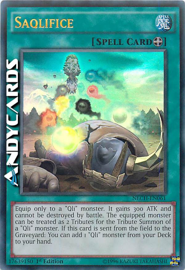 Equipaggia solo a un mostro "Qli". Esso guadagna 300 ATK e non può essere distrutto in battaglia. Il mostro equipaggiato può essere considerato come 2 Tributi per l'Evocazione tramite Tributo di un mostro "Qli". Se questa carta viene mandata dal Terreno al Cimitero: puoi aggiungere 1 mostro "Qli" dal tuo Deck alla tua mano.
