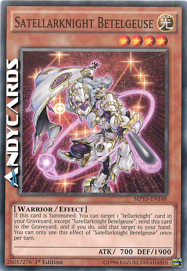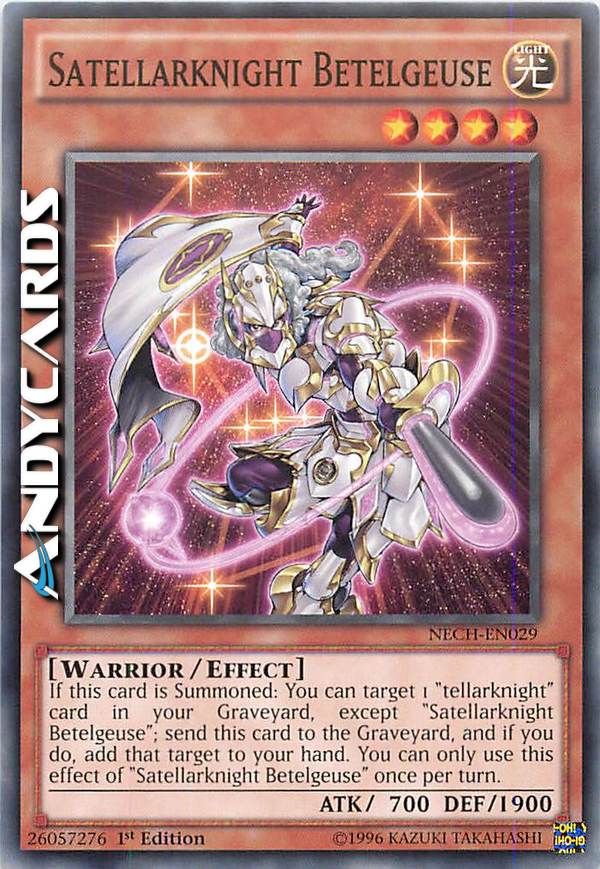 If this card is Summoned: You can target 1 "tellarknight" card in your Graveyard, except "Satellarknight Betelgeuse"; send this card to the Graveyard, and if you do, add that target to your hand. You can only use this effect of "Satellarknight Betelgeuse" once per turn.