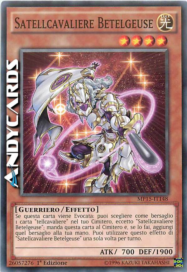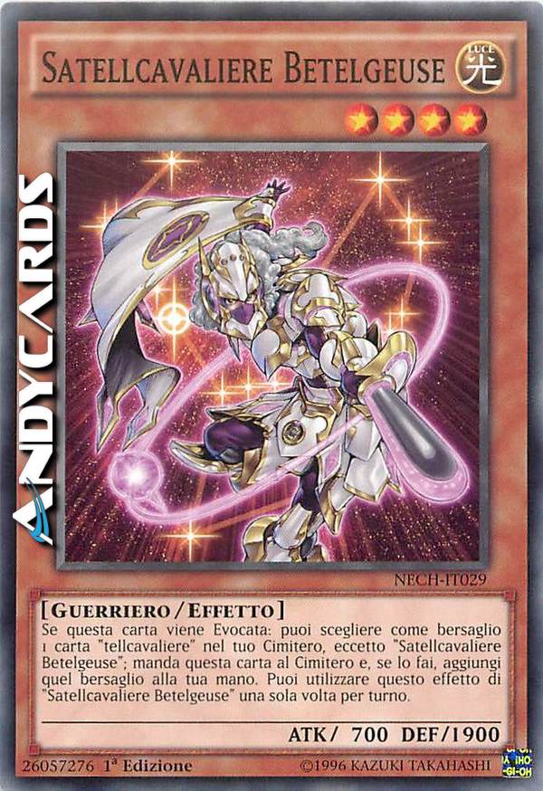 Se questa carta viene Evocata: puoi scegliere come bersaglio 1 carta "tellcavaliere" nel tuo Cimitero, eccetto "Satellcavaliere Betelgeuse"; manda questa carta al Cimitero e, se lo fai, aggiungi quel bersaglio alla tua mano. Puoi utilizzare questo effetto di "Satellcavaliere Betelgeuse" una sola volta per turno.